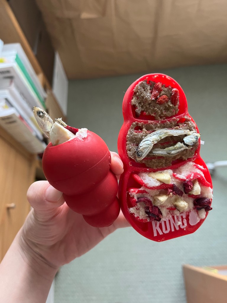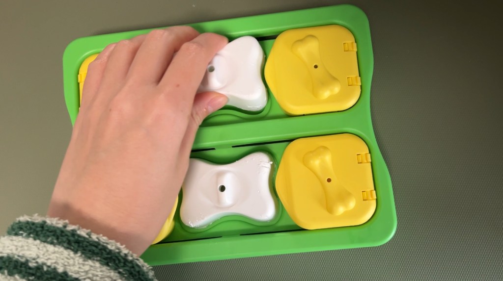 ペーストおやつや野菜、果物、フリーズドライなどを知育玩具やリックマット(舐めるためのマット)に塗ったり詰めたりして与えています。