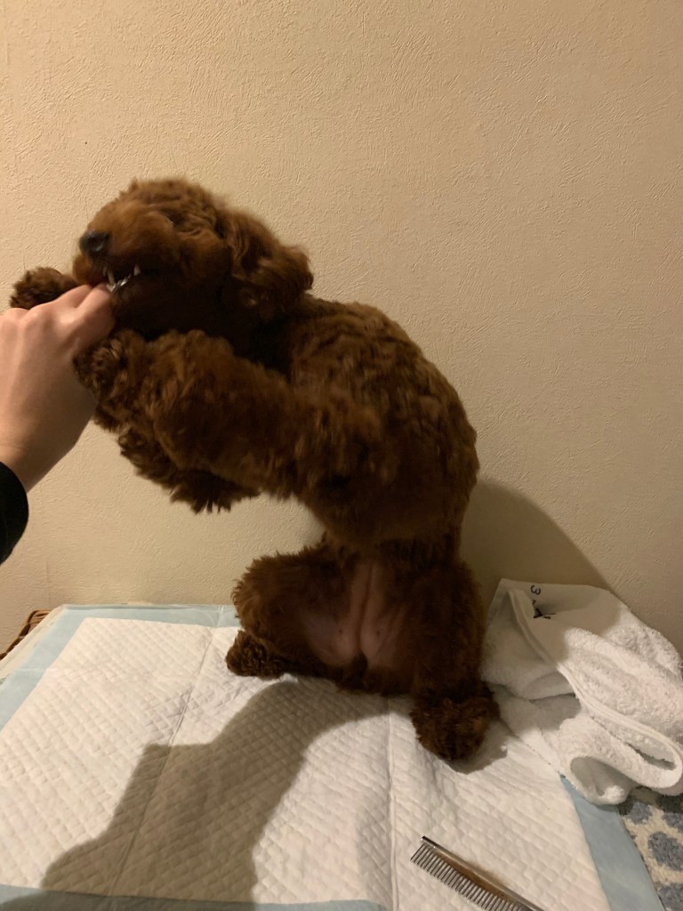 立ち上がり前足で飼い主の足をバリバリ引っ掻きました。